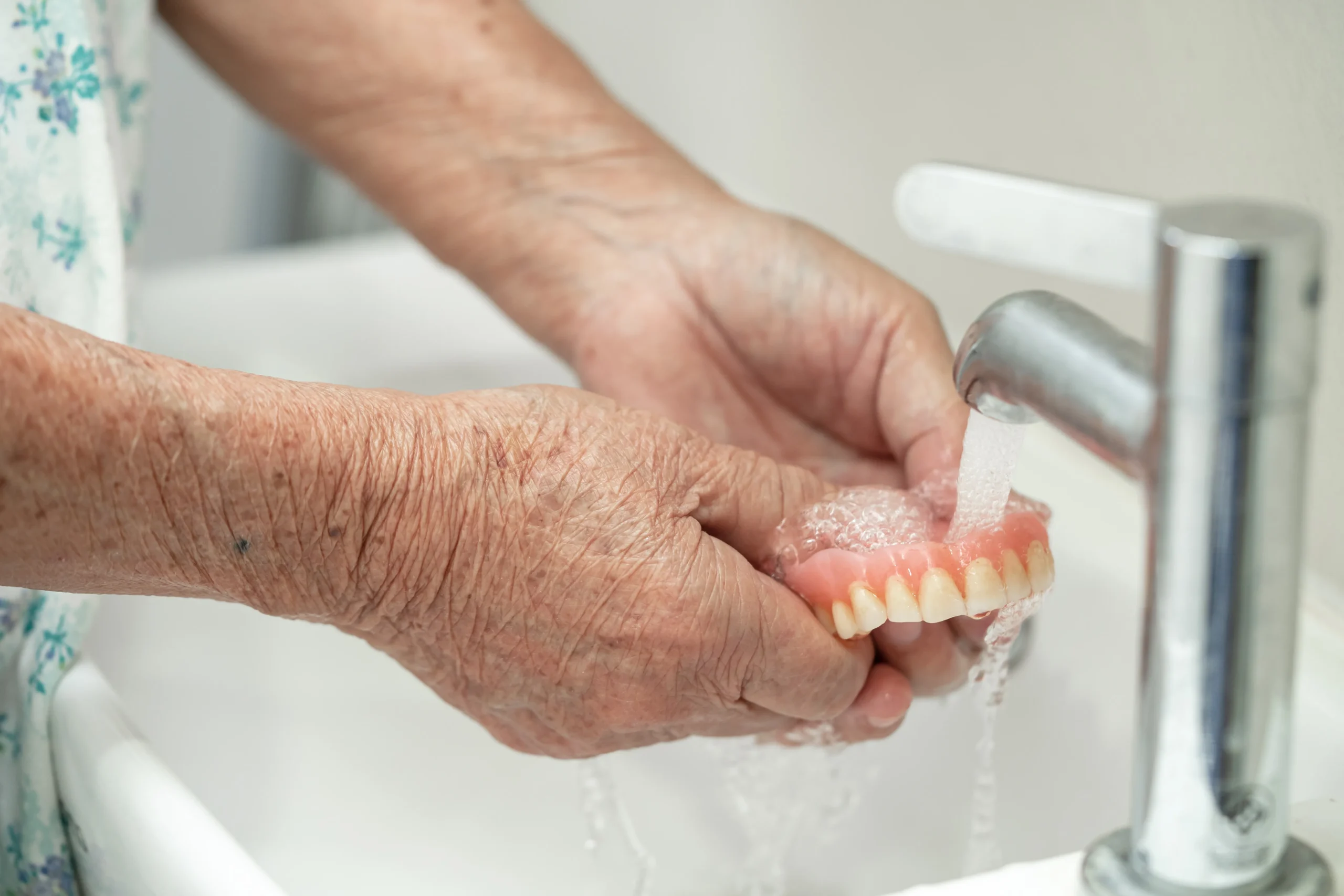 入れ歯を落として割ったり、熱湯で変形させたりしないよう注意が必要です。洗浄時は洗面器の上で行うなど、落下に備えた工夫をすると安全です。また、熱湯消毒は入れ歯の変形を招くため、避けてください。